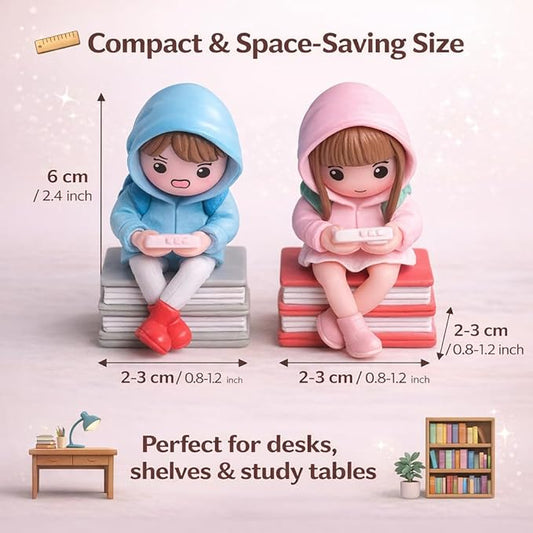 petzlifeworld Mini Student Reading Figurines Set – Cute Hoodie Kids Sitting on Books Resin Decor (1 Pair, Random Color) Desk, Shelf, Garden Decoration Gift