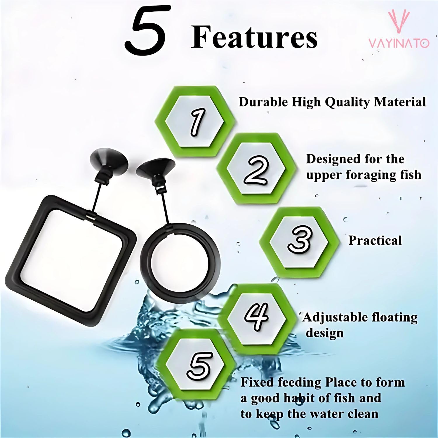 - 🐬【REDUCES DEBRIS AND ENHANCES WATER QUALITY】--- By placing your pet fish's food directly into the feeder Ring, the VAYINATO Floating Fish Feeding Ring effectively prevents flakes and pellets from floating into the filter system. This not only maintains a clearer and more visually appealing aquarium but also improves the overall water quality by reducing excess debris throughout the tank.