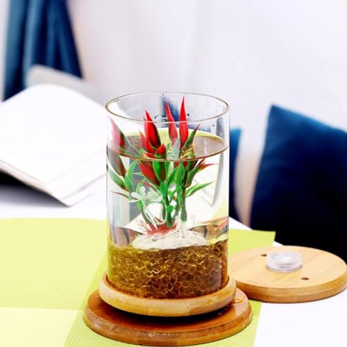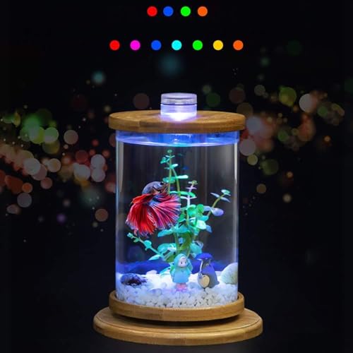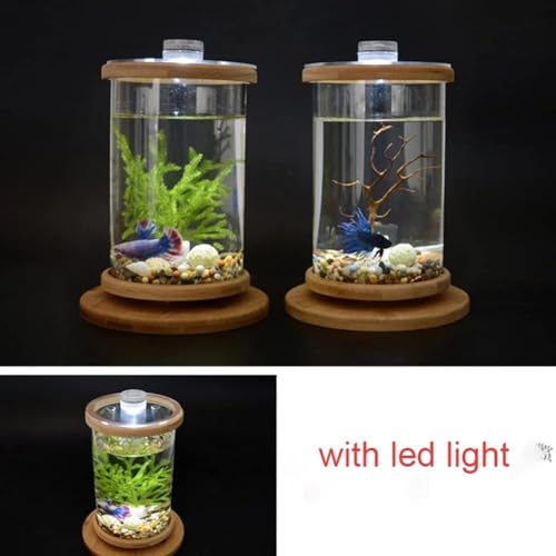 PetzLifeworld Mini Glass Cyl Shape Wooden Bamboo Base 360 Degree Rotating Closed Deskop, Table Home Decoration Bowl Aquarium Fish Tank with Top LED Light for Betta | 15CM*10CM